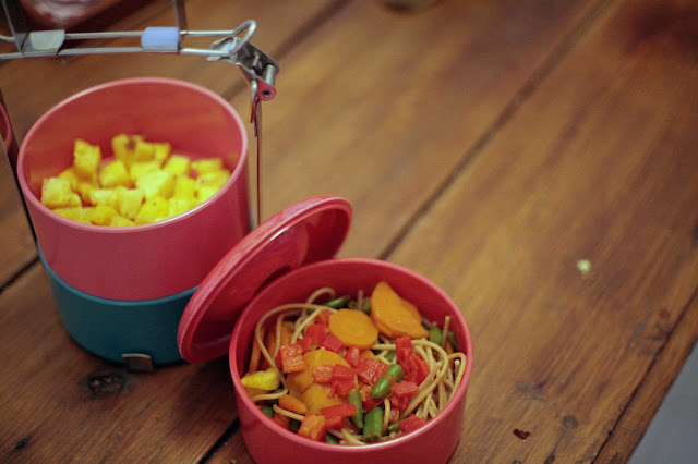 Prepacking my lunches is something I would like to be able to do more often. Somedays I manage to organize myself to do it (today I did!): pasta with mixed vegetables and juicy pineapple. Yum.